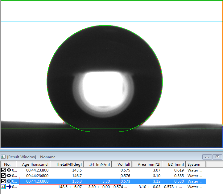 2、专业的接触角测量仪,或者真正的接触角测量仪必须是建议在Young-Laplace方程拟合的基础上的。判断是否采用了Young-Laplace方程拟合算法的方法非常简单,将如上第1、6和第7行的第一张图片下载下来后,分析其接触角值。如果能够实现边缘拟合度好,且出现接近我们公示的角度值且能够出现相应的表面张力值时,则说明该软件采用了Young-Laplace方程拟合算法,否则极可能是采用椭圆拟合的假Young-Laplace方程拟合算法。